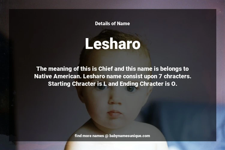 The name Lesharo is chosen by those who are willing to find Unique Boy Baby Names. The meaning of this is Chief and this name is belongs to Native American Origin. Baby Name Lesharo consist upon 7 chracters. Starting alphabet is L and ending alphabet is O. This name is used primarily by parents who are considering unique baby names for Boy. The Zodiac Sign suitbale for this name are;