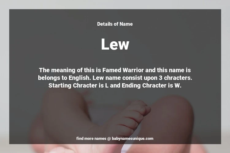 The name Lew is chosen by those who are willing to find Unique Boy Baby Names. The meaning of this is Famed Warrior and this name is belongs to English Origin. Baby Name Lew consist upon 3 chracters. Starting alphabet is L and ending alphabet is W. This name is used primarily by parents who are considering unique baby names for Boy. The Zodiac Sign suitbale for this name are;