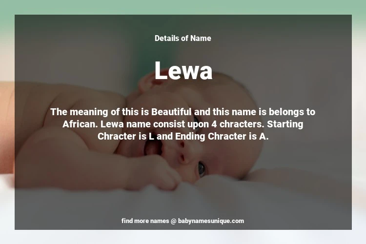 The name Lewa is chosen by those who are willing to find Unique Transgenders Baby Names. The meaning of this is Beautiful and this name is belongs to African Origin. Baby Name Lewa consist upon 4 chracters. Starting alphabet is L and ending alphabet is A. This name is used primarily by parents who are considering unique baby names for Transgenders. The Zodiac Sign suitbale for this name are;