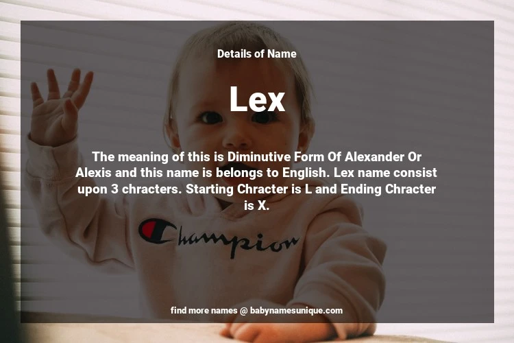 The name Lex is chosen by those who are willing to find Unique Transgenders Baby Names. The meaning of this is Diminutive Form Of Alexander Or Alexis and this name is belongs to English Origin. Baby Name Lex consist upon 3 chracters. Starting alphabet is L and ending alphabet is X. This name is used primarily by parents who are considering unique baby names for Transgenders. The Zodiac Sign suitbale for this name are;