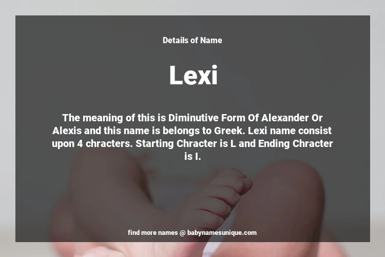 The name Lexi is chosen by those who are willing to find Unique Transgenders Baby Names. The meaning of this is Diminutive Form Of Alexander Or Alexis and this name is belongs to Greek Origin. Baby Name Lexi consist upon 4 chracters. Starting alphabet is L and ending alphabet is I. This name is used primarily by parents who are considering unique baby names for Transgenders. The Zodiac Sign suitbale for this name are;