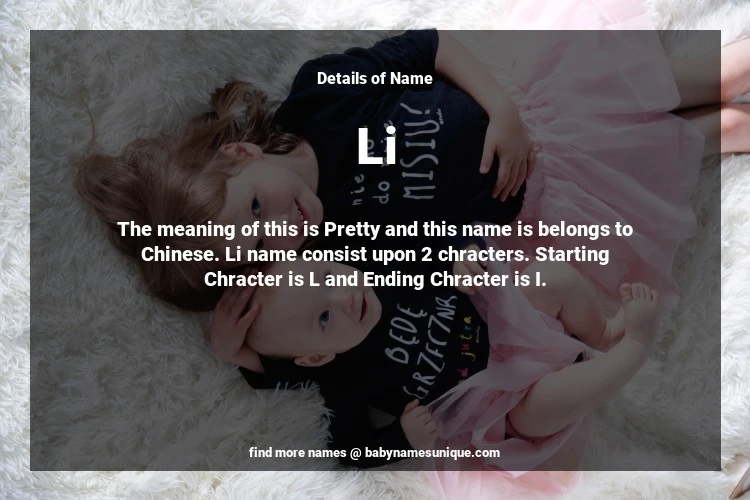 The name Li is chosen by those who are willing to find Unique Transgenders Baby Names. The meaning of this is Pretty and this name is belongs to Chinese Origin. Baby Name Li consist upon 2 chracters. Starting alphabet is L and ending alphabet is I. This name is used primarily by parents who are considering unique baby names for Transgenders. The Zodiac Sign suitbale for this name are;