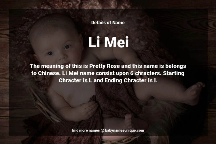 The name Li Mei is chosen by those who are willing to find Unique Transgenders Baby Names. The meaning of this is Pretty Rose and this name is belongs to Chinese Origin. Baby Name Li Mei consist upon 6 chracters. Starting alphabet is L and ending alphabet is I. This name is used primarily by parents who are considering unique baby names for Transgenders. The Zodiac Sign suitbale for this name are;