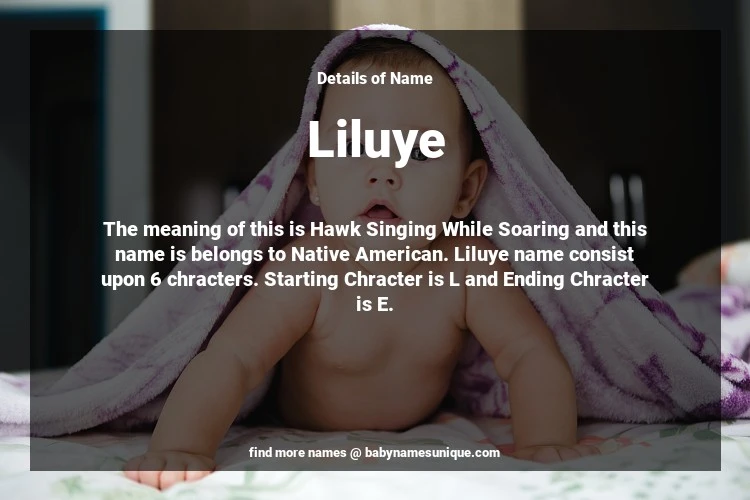 The name Liluye is chosen by those who are willing to find Unique Transgenders Baby Names. The meaning of this is Hawk Singing While Soaring and this name is belongs to Native American Origin. Baby Name Liluye consist upon 6 chracters. Starting alphabet is L and ending alphabet is E. This name is used primarily by parents who are considering unique baby names for Transgenders. The Zodiac Sign suitbale for this name are;