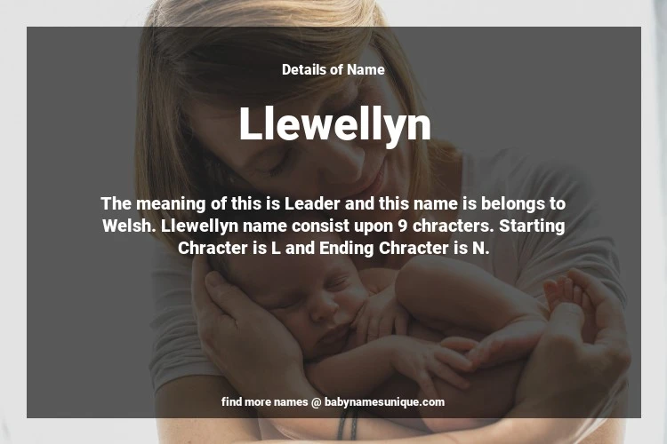 The name Llewellyn is chosen by those who are willing to find Unique Boy Baby Names. The meaning of this is Leader and this name is belongs to Welsh Origin. Baby Name Llewellyn consist upon 9 chracters. Starting alphabet is L and ending alphabet is N. This name is used primarily by parents who are considering unique baby names for Boy. The Zodiac Sign suitbale for this name are;
