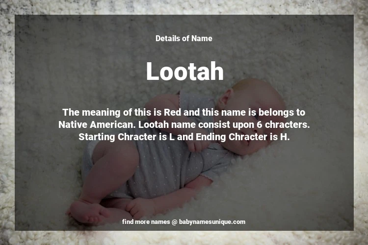 The name Lootah is chosen by those who are willing to find Unique Boy Baby Names. The meaning of this is Red and this name is belongs to Native American Origin. Baby Name Lootah consist upon 6 chracters. Starting alphabet is L and ending alphabet is H. This name is used primarily by parents who are considering unique baby names for Boy. The Zodiac Sign suitbale for this name are;