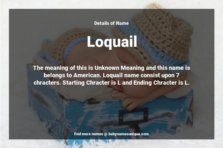 The name Loquail is chosen by those who are willing to find Unique Boy Baby Names. The meaning of this is Unknown Meaning and this name is belongs to American Origin. Baby Name Loquail consist upon 7 chracters. Starting alphabet is L and ending alphabet is L. This name is used primarily by parents who are considering unique baby names for Boy. The Zodiac Sign suitbale for this name are;