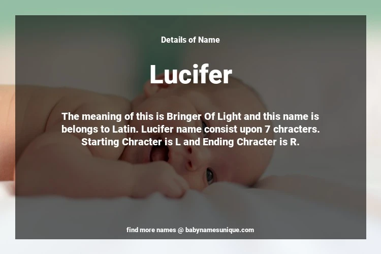 The name Lucifer is chosen by those who are willing to find Unique Boy Baby Names. The meaning of this is Bringer Of Light and this name is belongs to Latin Origin. Baby Name Lucifer consist upon 7 chracters. Starting alphabet is L and ending alphabet is R. This name is used primarily by parents who are considering unique baby names for Boy. The Zodiac Sign suitbale for this name are;