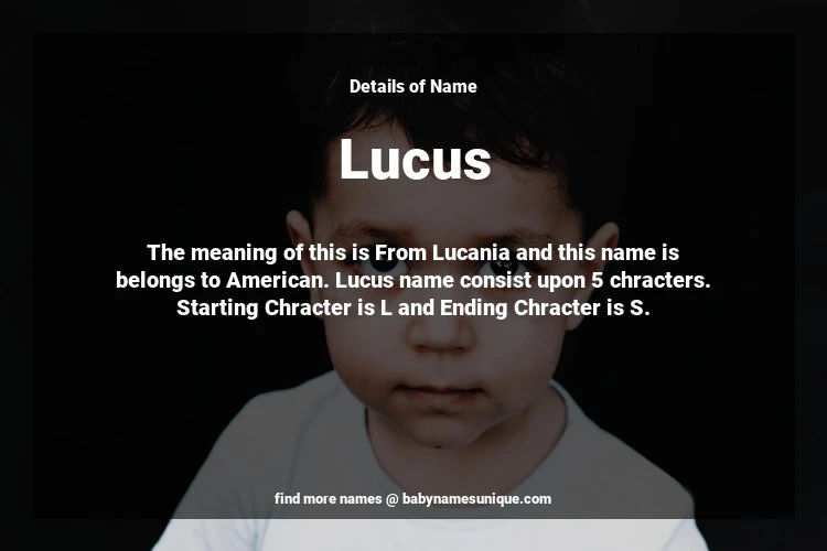 The name Lucus is chosen by those who are willing to find Unique Boy Baby Names. The meaning of this is From Lucania and this name is belongs to American Origin. Baby Name Lucus consist upon 5 chracters. Starting alphabet is L and ending alphabet is S. This name is used primarily by parents who are considering unique baby names for Boy. The Zodiac Sign suitbale for this name are;