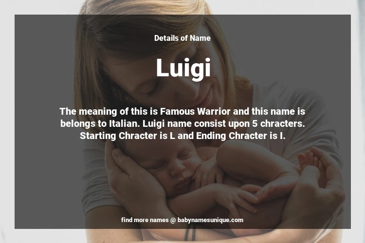 The name Luigi is chosen by those who are willing to find Unique Boy Baby Names. The meaning of this is Famous Warrior and this name is belongs to Italian Origin. Baby Name Luigi consist upon 5 chracters. Starting alphabet is L and ending alphabet is I. This name is used primarily by parents who are considering unique baby names for Boy. The Zodiac Sign suitbale for this name are;