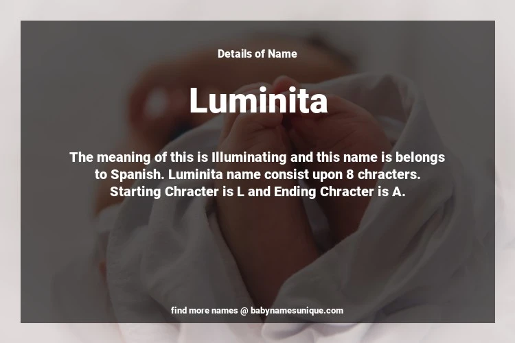 The name Luminita is chosen by those who are willing to find Unique Transgenders Baby Names. The meaning of this is Illuminating and this name is belongs to Spanish Origin. Baby Name Luminita consist upon 8 chracters. Starting alphabet is L and ending alphabet is A. This name is used primarily by parents who are considering unique baby names for Transgenders. The Zodiac Sign suitbale for this name are;