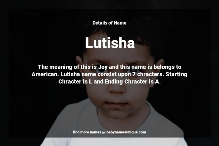 The name Lutisha is chosen by those who are willing to find Unique Transgenders Baby Names. The meaning of this is Joy and this name is belongs to American Origin. Baby Name Lutisha consist upon 7 chracters. Starting alphabet is L and ending alphabet is A. This name is used primarily by parents who are considering unique baby names for Transgenders. The Zodiac Sign suitbale for this name are;