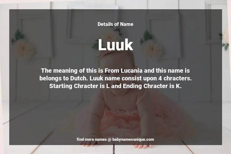 The name Luuk is chosen by those who are willing to find Unique Boy Baby Names. The meaning of this is From Lucania and this name is belongs to Dutch Origin. Baby Name Luuk consist upon 4 chracters. Starting alphabet is L and ending alphabet is K. This name is used primarily by parents who are considering unique baby names for Boy. The Zodiac Sign suitbale for this name are;