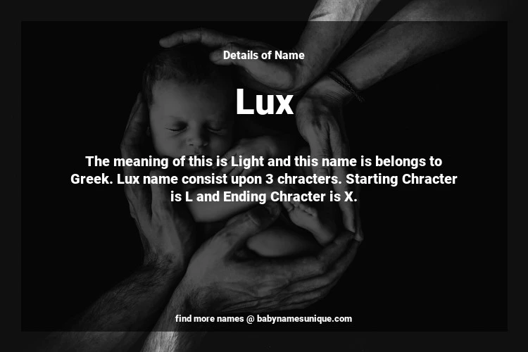 The name Lux is chosen by those who are willing to find Unique Transgenders Baby Names. The meaning of this is Light and this name is belongs to Greek Origin. Baby Name Lux consist upon 3 chracters. Starting alphabet is L and ending alphabet is X. This name is used primarily by parents who are considering unique baby names for Transgenders. The Zodiac Sign suitbale for this name are;