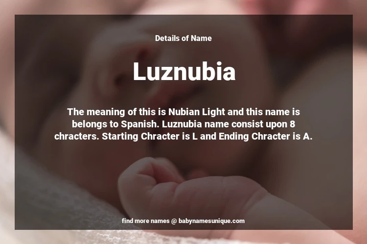 The name Luznubia is chosen by those who are willing to find Unique Transgenders Baby Names. The meaning of this is Nubian Light and this name is belongs to Spanish Origin. Baby Name Luznubia consist upon 8 chracters. Starting alphabet is L and ending alphabet is A. This name is used primarily by parents who are considering unique baby names for Transgenders. The Zodiac Sign suitbale for this name are;