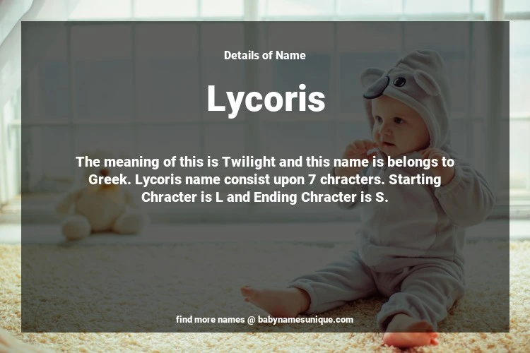 The name Lycoris is chosen by those who are willing to find Unique Transgenders Baby Names. The meaning of this is Twilight and this name is belongs to Greek Origin. Baby Name Lycoris consist upon 7 chracters. Starting alphabet is L and ending alphabet is S. This name is used primarily by parents who are considering unique baby names for Transgenders. The Zodiac Sign suitbale for this name are;