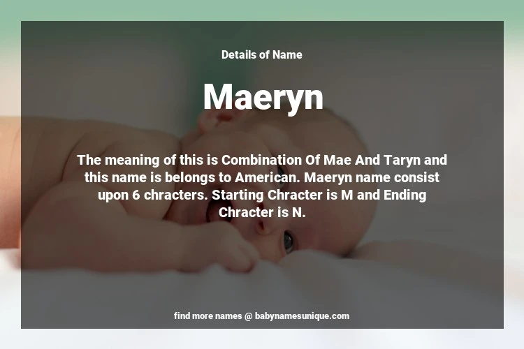 The name Maeryn is chosen by those who are willing to find Unique Transgenders Baby Names. The meaning of this is Combination Of Mae And Taryn and this name is belongs to American Origin. Baby Name Maeryn consist upon 6 chracters. Starting alphabet is M and ending alphabet is N. This name is used primarily by parents who are considering unique baby names for Transgenders. The Zodiac Sign suitbale for this name are;