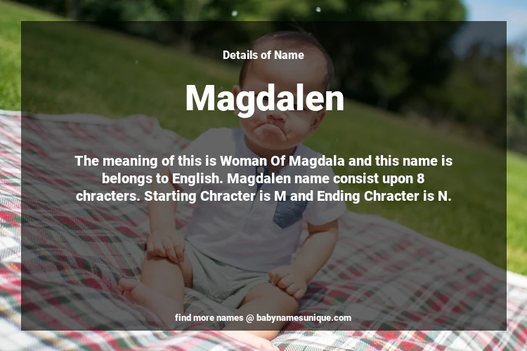 The name Magdalen is chosen by those who are willing to find Unique Transgenders Baby Names. The meaning of this is Woman Of Magdala and this name is belongs to English Origin. Baby Name Magdalen consist upon 8 chracters. Starting alphabet is M and ending alphabet is N. This name is used primarily by parents who are considering unique baby names for Transgenders. The Zodiac Sign suitbale for this name are;