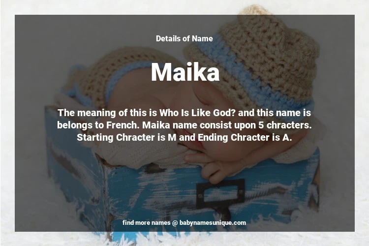 The name Maika is chosen by those who are willing to find Unique Transgenders Baby Names. The meaning of this is Who Is Like God? and this name is belongs to French Origin. Baby Name Maika consist upon 5 chracters. Starting alphabet is M and ending alphabet is A. This name is used primarily by parents who are considering unique baby names for Transgenders. The Zodiac Sign suitbale for this name are;