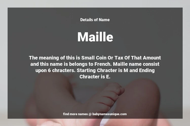 The name Maille is chosen by those who are willing to find Unique Transgenders Baby Names. The meaning of this is Small Coin Or Tax Of That Amount and this name is belongs to French Origin. Baby Name Maille consist upon 6 chracters. Starting alphabet is M and ending alphabet is E. This name is used primarily by parents who are considering unique baby names for Transgenders. The Zodiac Sign suitbale for this name are;