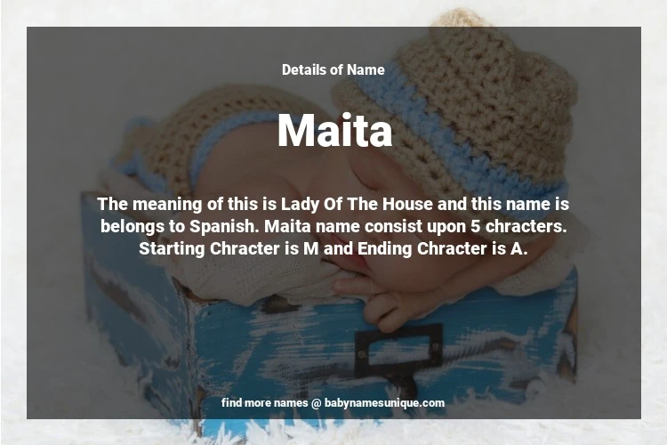 The name Maita is chosen by those who are willing to find Unique Transgenders Baby Names. The meaning of this is Lady Of The House and this name is belongs to Spanish Origin. Baby Name Maita consist upon 5 chracters. Starting alphabet is M and ending alphabet is A. This name is used primarily by parents who are considering unique baby names for Transgenders. The Zodiac Sign suitbale for this name are;