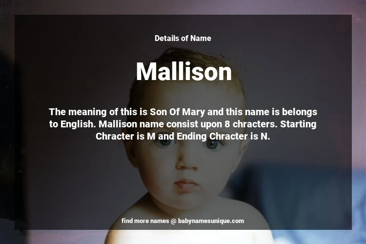 The name Mallison is chosen by those who are willing to find Unique Transgenders Baby Names. The meaning of this is Son Of Mary and this name is belongs to English Origin. Baby Name Mallison consist upon 8 chracters. Starting alphabet is M and ending alphabet is N. This name is used primarily by parents who are considering unique baby names for Transgenders. The Zodiac Sign suitbale for this name are;