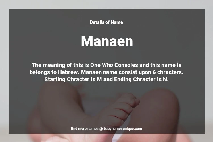 The name Manaen is chosen by those who are willing to find Unique Boy Baby Names. The meaning of this is One Who Consoles and this name is belongs to Hebrew Origin. Baby Name Manaen consist upon 6 chracters. Starting alphabet is M and ending alphabet is N. This name is used primarily by parents who are considering unique baby names for Boy. The Zodiac Sign suitbale for this name are;