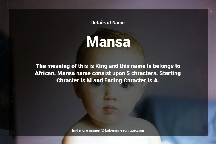 The name Mansa is chosen by those who are willing to find Unique Transgenders Baby Names. The meaning of this is King and this name is belongs to African Origin. Baby Name Mansa consist upon 5 chracters. Starting alphabet is M and ending alphabet is A. This name is used primarily by parents who are considering unique baby names for Transgenders. The Zodiac Sign suitbale for this name are;