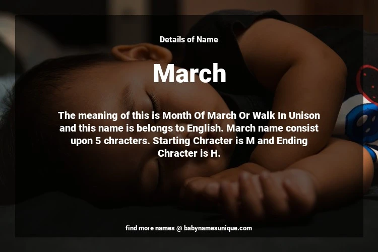 The name March is chosen by those who are willing to find Unique Transgenders Baby Names. The meaning of this is Month Of March Or Walk In Unison and this name is belongs to English Origin. Baby Name March consist upon 5 chracters. Starting alphabet is M and ending alphabet is H. This name is used primarily by parents who are considering unique baby names for Transgenders. The Zodiac Sign suitbale for this name are;