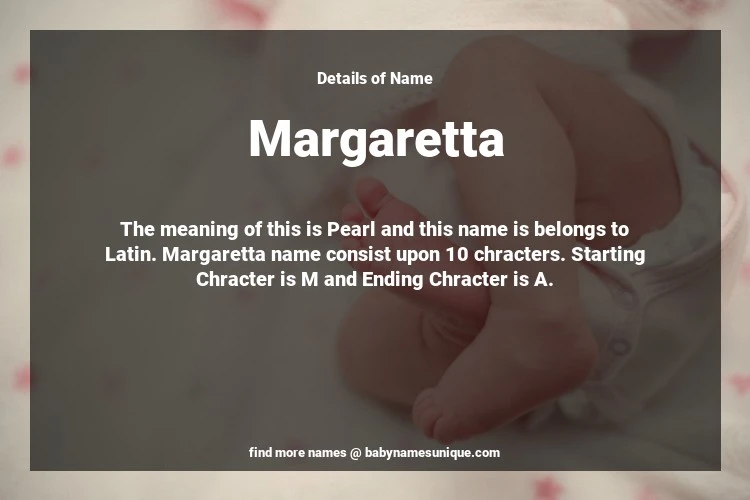 The name Margaretta is chosen by those who are willing to find Unique Transgenders Baby Names. The meaning of this is Pearl and this name is belongs to Latin Origin. Baby Name Margaretta consist upon 10 chracters. Starting alphabet is M and ending alphabet is A. This name is used primarily by parents who are considering unique baby names for Transgenders. The Zodiac Sign suitbale for this name are;