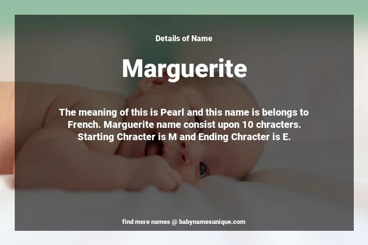 The name Marguerite is chosen by those who are willing to find Unique Transgenders Baby Names. The meaning of this is Pearl and this name is belongs to French Origin. Baby Name Marguerite consist upon 10 chracters. Starting alphabet is M and ending alphabet is E. This name is used primarily by parents who are considering unique baby names for Transgenders. The Zodiac Sign suitbale for this name are;