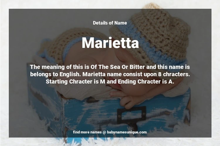 The name Marietta is chosen by those who are willing to find Unique Transgenders Baby Names. The meaning of this is Of The Sea Or Bitter and this name is belongs to English Origin. Baby Name Marietta consist upon 8 chracters. Starting alphabet is M and ending alphabet is A. This name is used primarily by parents who are considering unique baby names for Transgenders. The Zodiac Sign suitbale for this name are;