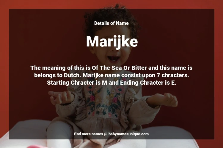 The name Marijke is chosen by those who are willing to find Unique Transgenders Baby Names. The meaning of this is Of The Sea Or Bitter and this name is belongs to Dutch Origin. Baby Name Marijke consist upon 7 chracters. Starting alphabet is M and ending alphabet is E. This name is used primarily by parents who are considering unique baby names for Transgenders. The Zodiac Sign suitbale for this name are;