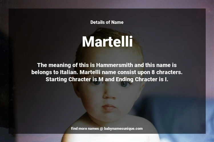 The name Martelli is chosen by those who are willing to find Unique Boy Baby Names. The meaning of this is Hammersmith and this name is belongs to Italian Origin. Baby Name Martelli consist upon 8 chracters. Starting alphabet is M and ending alphabet is I. This name is used primarily by parents who are considering unique baby names for Boy. The Zodiac Sign suitbale for this name are;