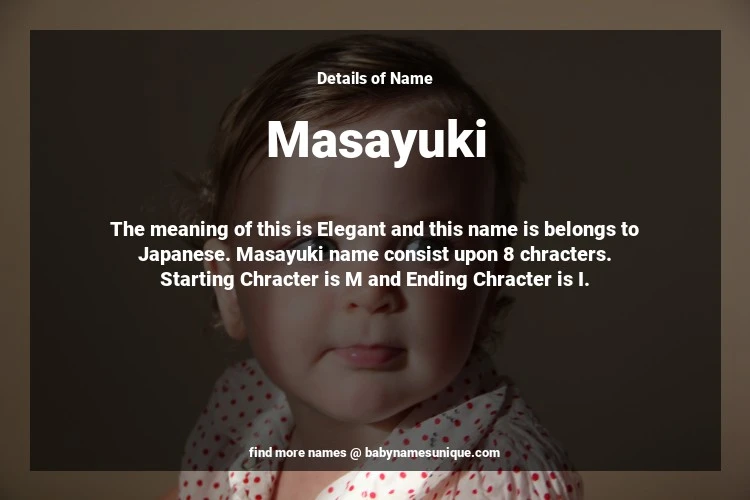 The name Masayuki is chosen by those who are willing to find Unique Boy Baby Names. The meaning of this is Elegant and this name is belongs to Japanese Origin. Baby Name Masayuki consist upon 8 chracters. Starting alphabet is M and ending alphabet is I. This name is used primarily by parents who are considering unique baby names for Boy. The Zodiac Sign suitbale for this name are;