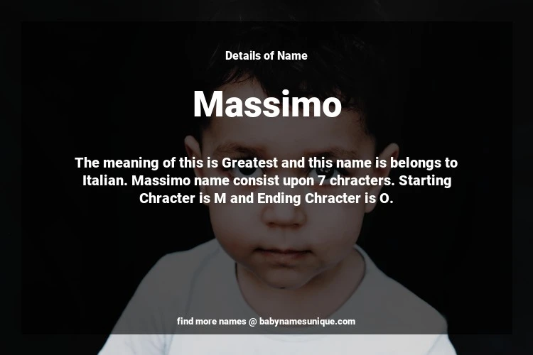 The name Massimo is chosen by those who are willing to find Unique Boy Baby Names. The meaning of this is Greatest and this name is belongs to Italian Origin. Baby Name Massimo consist upon 7 chracters. Starting alphabet is M and ending alphabet is O. This name is used primarily by parents who are considering unique baby names for Boy. The Zodiac Sign suitbale for this name are;