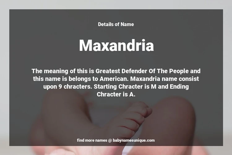 The name Maxandria is chosen by those who are willing to find Unique Transgenders Baby Names. The meaning of this is Greatest Defender Of The People and this name is belongs to American Origin. Baby Name Maxandria consist upon 9 chracters. Starting alphabet is M and ending alphabet is A. This name is used primarily by parents who are considering unique baby names for Transgenders. The Zodiac Sign suitbale for this name are;