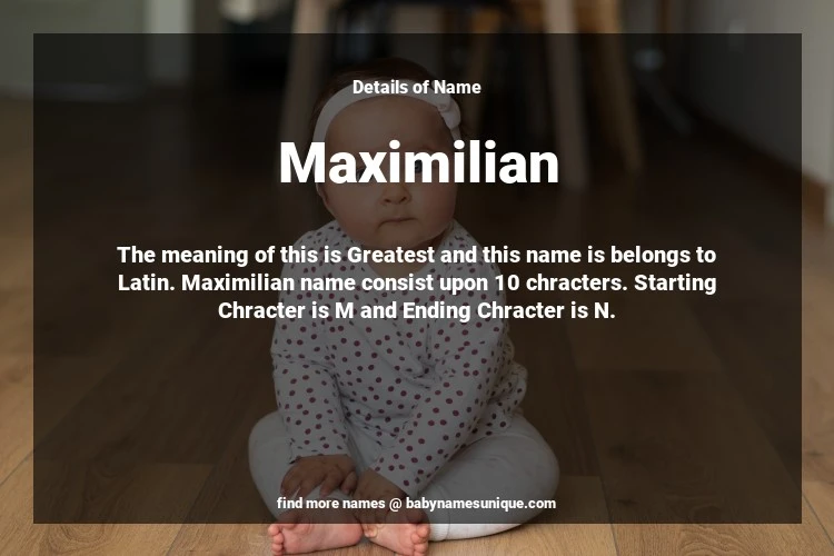 The name Maximilian is chosen by those who are willing to find Unique Boy Baby Names. The meaning of this is Greatest and this name is belongs to Latin Origin. Baby Name Maximilian consist upon 10 chracters. Starting alphabet is M and ending alphabet is N. This name is used primarily by parents who are considering unique baby names for Boy. The Zodiac Sign suitbale for this name are;