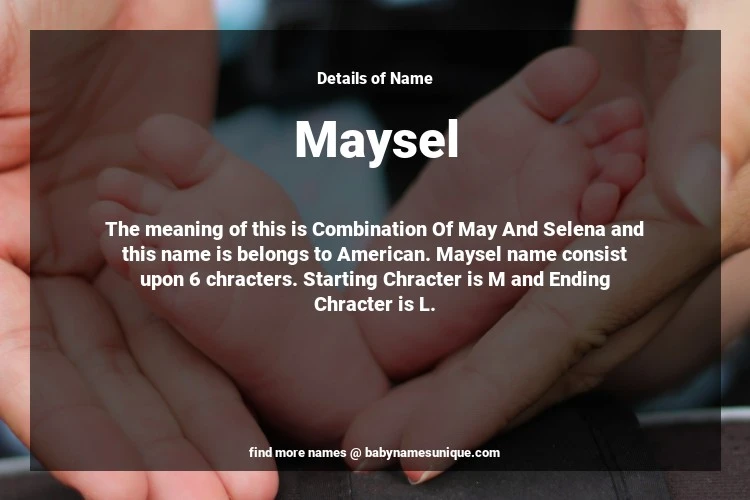 The name Maysel is chosen by those who are willing to find Unique Transgenders Baby Names. The meaning of this is Combination Of May And Selena and this name is belongs to American Origin. Baby Name Maysel consist upon 6 chracters. Starting alphabet is M and ending alphabet is L. This name is used primarily by parents who are considering unique baby names for Transgenders. The Zodiac Sign suitbale for this name are;