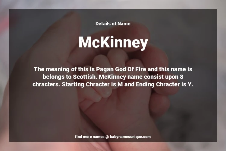 The name McKinney is chosen by those who are willing to find Unique Transgenders Baby Names. The meaning of this is Pagan God Of Fire and this name is belongs to Scottish Origin. Baby Name McKinney consist upon 8 chracters. Starting alphabet is M and ending alphabet is Y. This name is used primarily by parents who are considering unique baby names for Transgenders. The Zodiac Sign suitbale for this name are;