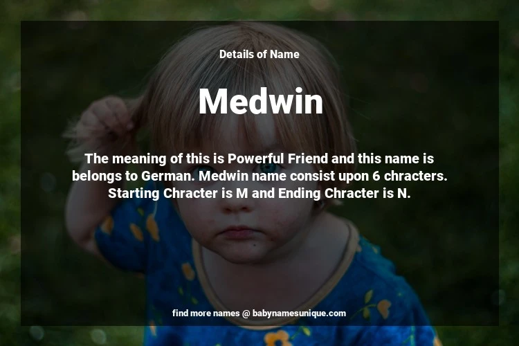 The name Medwin is chosen by those who are willing to find Unique Boy Baby Names. The meaning of this is Powerful Friend and this name is belongs to German Origin. Baby Name Medwin consist upon 6 chracters. Starting alphabet is M and ending alphabet is N. This name is used primarily by parents who are considering unique baby names for Boy. The Zodiac Sign suitbale for this name are;