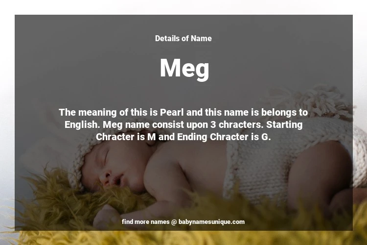 The name Meg is chosen by those who are willing to find Unique Transgenders Baby Names. The meaning of this is Pearl and this name is belongs to English Origin. Baby Name Meg consist upon 3 chracters. Starting alphabet is M and ending alphabet is G. This name is used primarily by parents who are considering unique baby names for Transgenders. The Zodiac Sign suitbale for this name are;
