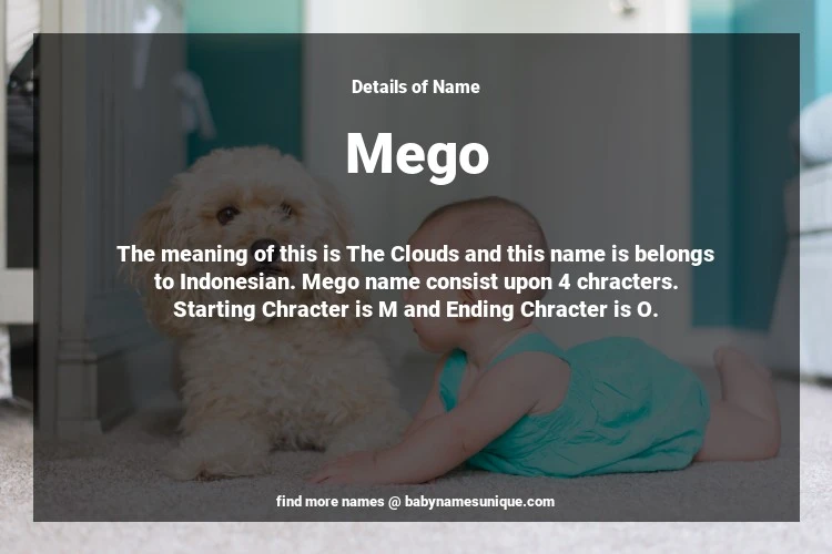 The name Mego is chosen by those who are willing to find Unique Boy Baby Names. The meaning of this is The Clouds and this name is belongs to Indonesian Origin. Baby Name Mego consist upon 4 chracters. Starting alphabet is M and ending alphabet is O. This name is used primarily by parents who are considering unique baby names for Boy. The Zodiac Sign suitbale for this name are;