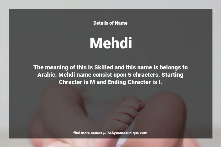 The name Mehdi is chosen by those who are willing to find Unique Boy Baby Names. The meaning of this is Skilled and this name is belongs to Arabic Origin. Baby Name Mehdi consist upon 5 chracters. Starting alphabet is M and ending alphabet is I. This name is used primarily by parents who are considering unique baby names for Boy. The Zodiac Sign suitbale for this name are;