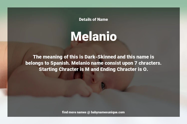The name Melanio is chosen by those who are willing to find Unique Boy Baby Names. The meaning of this is Dark-Skinned and this name is belongs to Spanish Origin. Baby Name Melanio consist upon 7 chracters. Starting alphabet is M and ending alphabet is O. This name is used primarily by parents who are considering unique baby names for Boy. The Zodiac Sign suitbale for this name are;