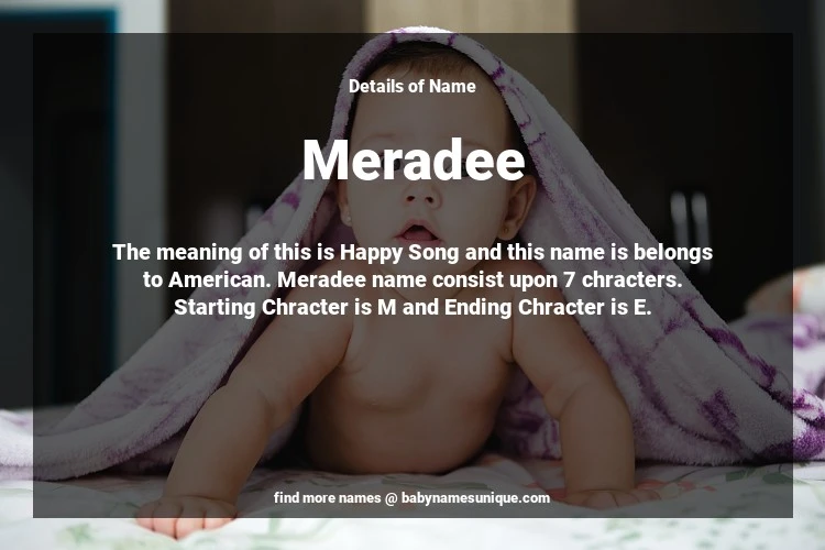 The name Meradee is chosen by those who are willing to find Unique Transgenders Baby Names. The meaning of this is Happy Song and this name is belongs to American Origin. Baby Name Meradee consist upon 7 chracters. Starting alphabet is M and ending alphabet is E. This name is used primarily by parents who are considering unique baby names for Transgenders. The Zodiac Sign suitbale for this name are;