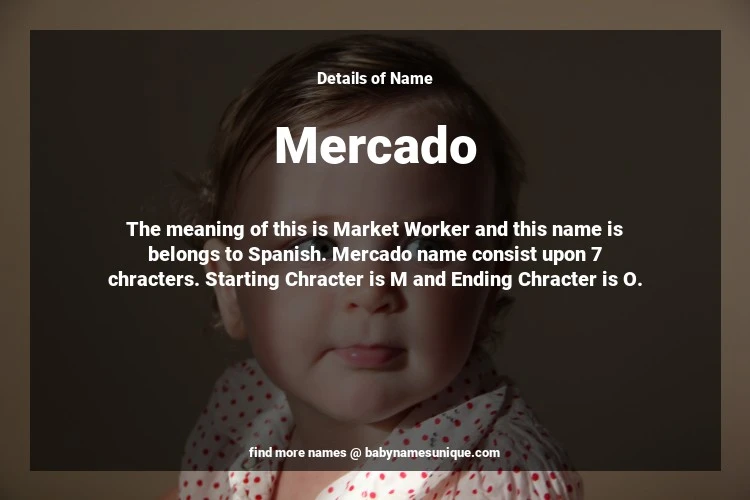 The name Mercado is chosen by those who are willing to find Unique Transgenders Baby Names. The meaning of this is Market Worker and this name is belongs to Spanish Origin. Baby Name Mercado consist upon 7 chracters. Starting alphabet is M and ending alphabet is O. This name is used primarily by parents who are considering unique baby names for Transgenders. The Zodiac Sign suitbale for this name are;