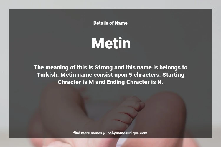 The name Metin is chosen by those who are willing to find Unique Boy Baby Names. The meaning of this is Strong and this name is belongs to Turkish Origin. Baby Name Metin consist upon 5 chracters. Starting alphabet is M and ending alphabet is N. This name is used primarily by parents who are considering unique baby names for Boy. The Zodiac Sign suitbale for this name are;