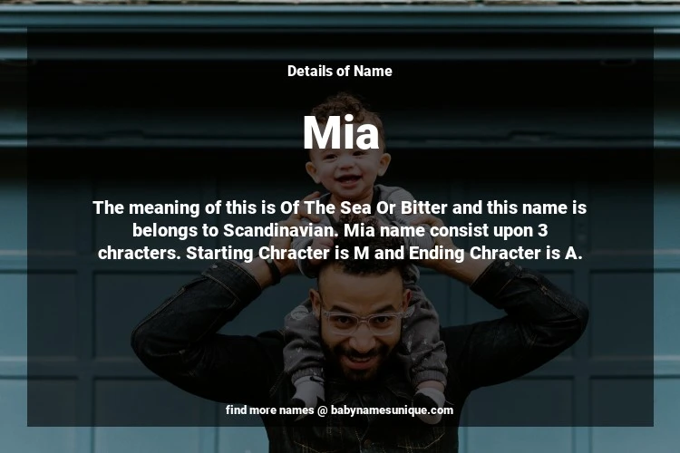 The name Mia is chosen by those who are willing to find Unique Transgenders Baby Names. The meaning of this is Of The Sea Or Bitter and this name is belongs to Scandinavian Origin. Baby Name Mia consist upon 3 chracters. Starting alphabet is M and ending alphabet is A. This name is used primarily by parents who are considering unique baby names for Transgenders. The Zodiac Sign suitbale for this name are;
