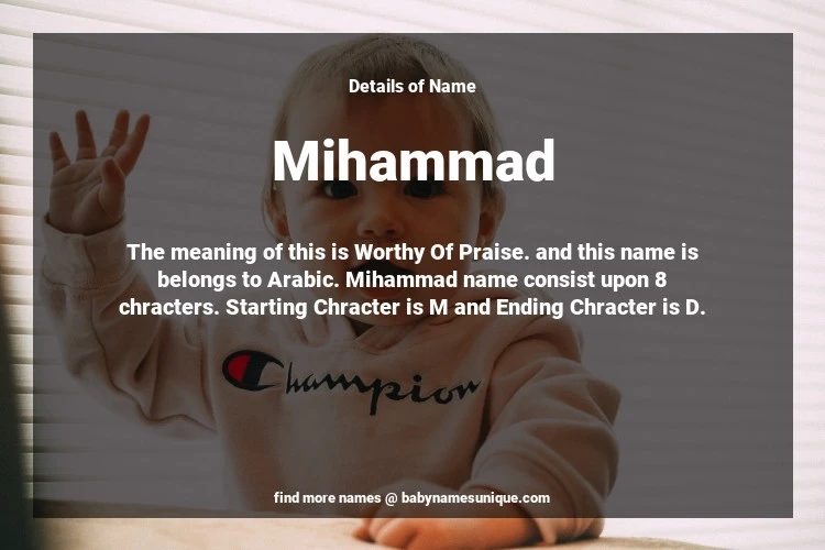 The name Mihammad is chosen by those who are willing to find Unique Boy Baby Names. The meaning of this is Worthy Of Praise. and this name is belongs to Arabic Origin. Baby Name Mihammad consist upon 8 chracters. Starting alphabet is M and ending alphabet is D. This name is used primarily by parents who are considering unique baby names for Boy. The Zodiac Sign suitbale for this name are;
